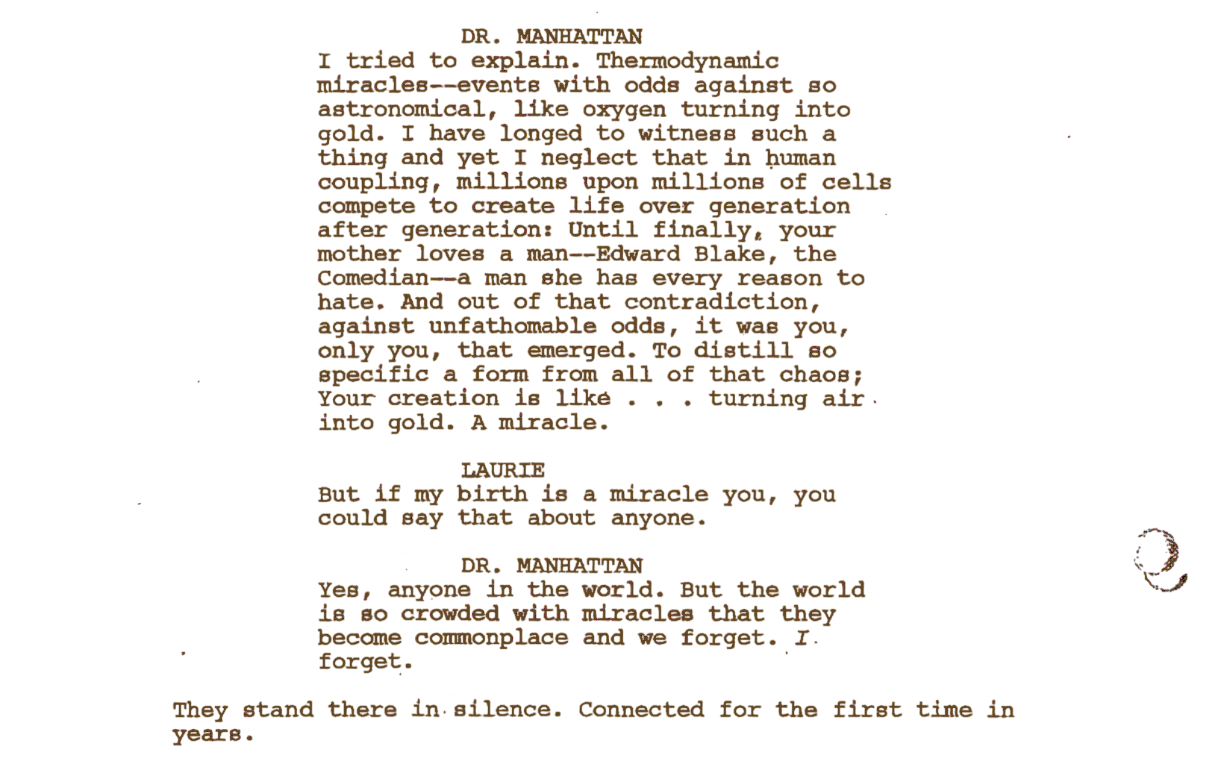 For a being who perceives time as fixed and causality as deterministic, this spontaneous beauty in chaos reignites his appreciation for human life. It reminds him that even in a universe ruled by laws, meaning can still emerge—not despite entropy, but because of it. By recognizing Laurie as a miracle, Dr. Manhattan rediscovers his own capacity for wonder, and with it, a glimpse of the man he once was.