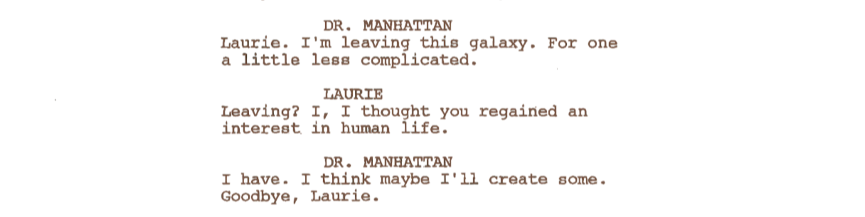 This kind of meaning only becomes clear to Dr. Manhattan much later, through a different truth he discovers. The unity of opposites.